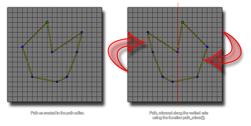 This function takes all the path points and mirrors them along the vertical axis. This function changes the actual path resource, and so will permanently affect how the path is used by all instances