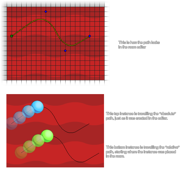 As you can see in the above image, the two instances are following the same path started with path_start(), but one of the instances is following the absolute path while the other is following the relative path. It should be noted that when relative is set to false (absolute) the instance will "jump" to the start of the path no matter where in the room it is placed.