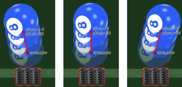 In the above example the spring object at the bottom has created a force on the ball object getting it to move in a different direction. The exact force is defined by the vector we get from the components xforce/yforce