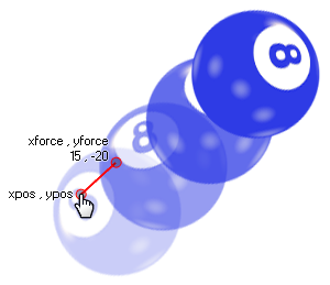 As you can see, the player has clicked on the ball and this has given it an impulse to move to the upper right, spinning as it goes. The exact impulse is defined by the vector we get from the components