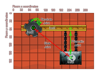 If you want to create a sophisticated mechanical contraption you might want to use gears. In principle you can create gears in GameMaker: Studio by using compounding instances to model gear teeth, but this is not very efficient and might be tedious to author! Thankfully there is a simpler method, and that is to use a gear joint. To make one you need to have previously defined your fixtures and created the two basic joints that are going to comprise your gear - these must be made up of one revolute joint and either a prismatic joint or another revolute joint. The image below shows how a gear would typically be created in a game: So what happens? Well, once the two joints are added into the gear, interaction with one will have an effect on the other, so in the example image above, if you rotate inst2, inst3 will move up and down, or if you move inst3 up and down then inst2 will rotate. You can also change the gear ratio, meaning that you need to move one instance more (or less) to get the desired effect. The code in the example at the bottom shows how something like the image above can be created.