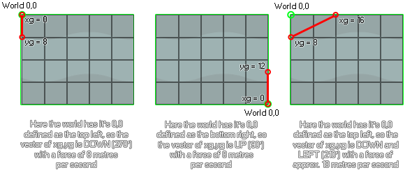 As you can see, the xg,yg coordinates are relative to the position of 0,0 as defined for the physics world, and the gravity itself is calculated as a vector of those two components. So, the default values of 0,10 will