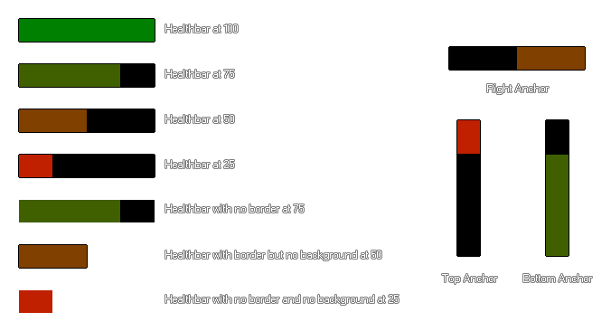 You can set various different things that change the visual aspect of the bar and these are illustrated in the image below (note that the colours used here are c_green for the maximum