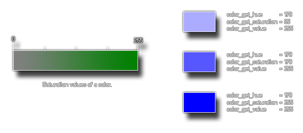 This function will return the saturation of the given colour. This is the amount of the colour tone that is mixed into the final colour and is part of the hue, saturation and value (luminosity) method for defining