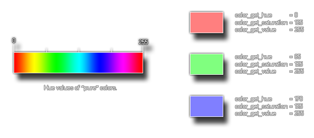 This function will return the hue of the given colour. This is the "pure" colour tone which is part of the hue, saturation and value (luminosity) method for defining a colour. The following image illustrates how