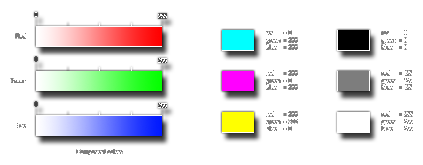 GameMaker: Studio provides this function (as well as others) to permit the user to make their own colours. This particular function takes three component parts, the red, the green and the blue components of the colour that you wish to make. These values are taken as being between 0 and 255 so you can make 16,777,216 (256*256*256) colours with this! Below you can see an image of how these components look when separated: The image on the left is a break-down of the individual components of the function, and then on the right is an illustration of how changing these components affects the end colour.